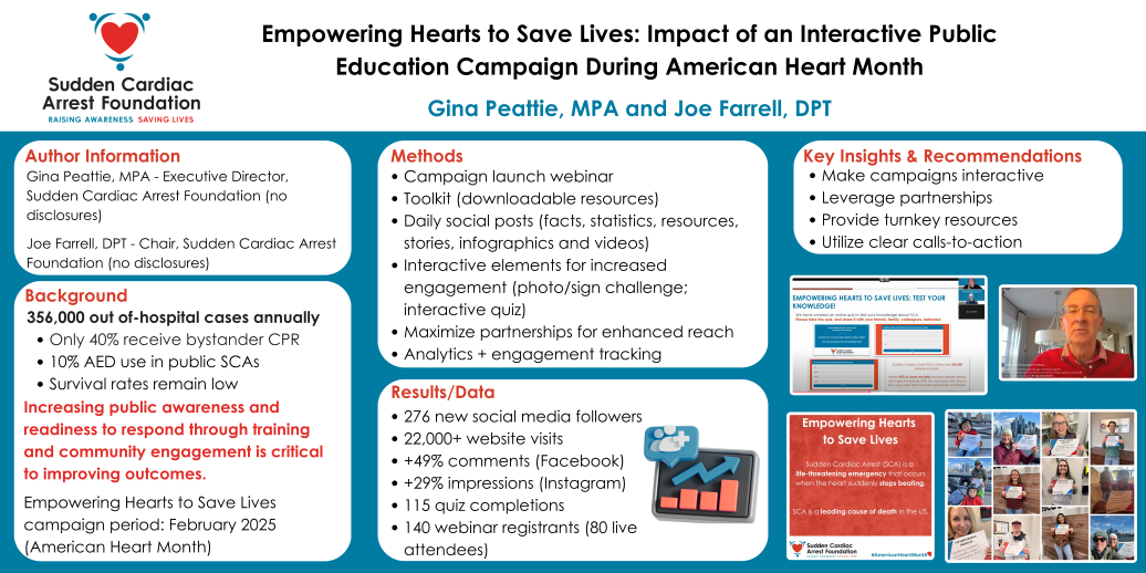 The Sudden Cardiac Arrest Foundation (SCAF) conducted a one-month public awareness campaign, Empowering Hearts to Save Lives, during February 2025 to boost understanding of sudden cardiac arrest (SCA), promote CPR and AED training, and inspire community engagement. Through daily social media posts, a kickoff webinar, and partnerships such as with the National Athletic Trainers’ Association, the campaign shared facts, survivor stories, and actionable resources. Compared to the previous year, Facebook engagement increased by 29%, comments by 49%, and website visits surpassed 22,000, with notable growth across all platforms. The initiative demonstrated that concise, interactive campaigns supported by collaboration, specific calls-to-action and accessible tools can significantly enhance public awareness, education and engagement.