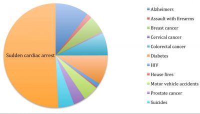 Sudden cardiac arrest, a sudden and unexpected pulseless condition, strikes 382,500 people outside hospitals every day in the U.S.—and 92% of victims die. That’s more than the number who die from Alzheimers, assault with firearms, breast cancer, colorectal cancer, diabetes, HIV, house fires, motor vehicle accidents, prostate cancer, and suicides combined. Those who survive invariably received immediate CPR and treatment with a defibrillator. This is why it is so important for the public to be trained in CPR and the use of automated external defibrillators, or AEDs.